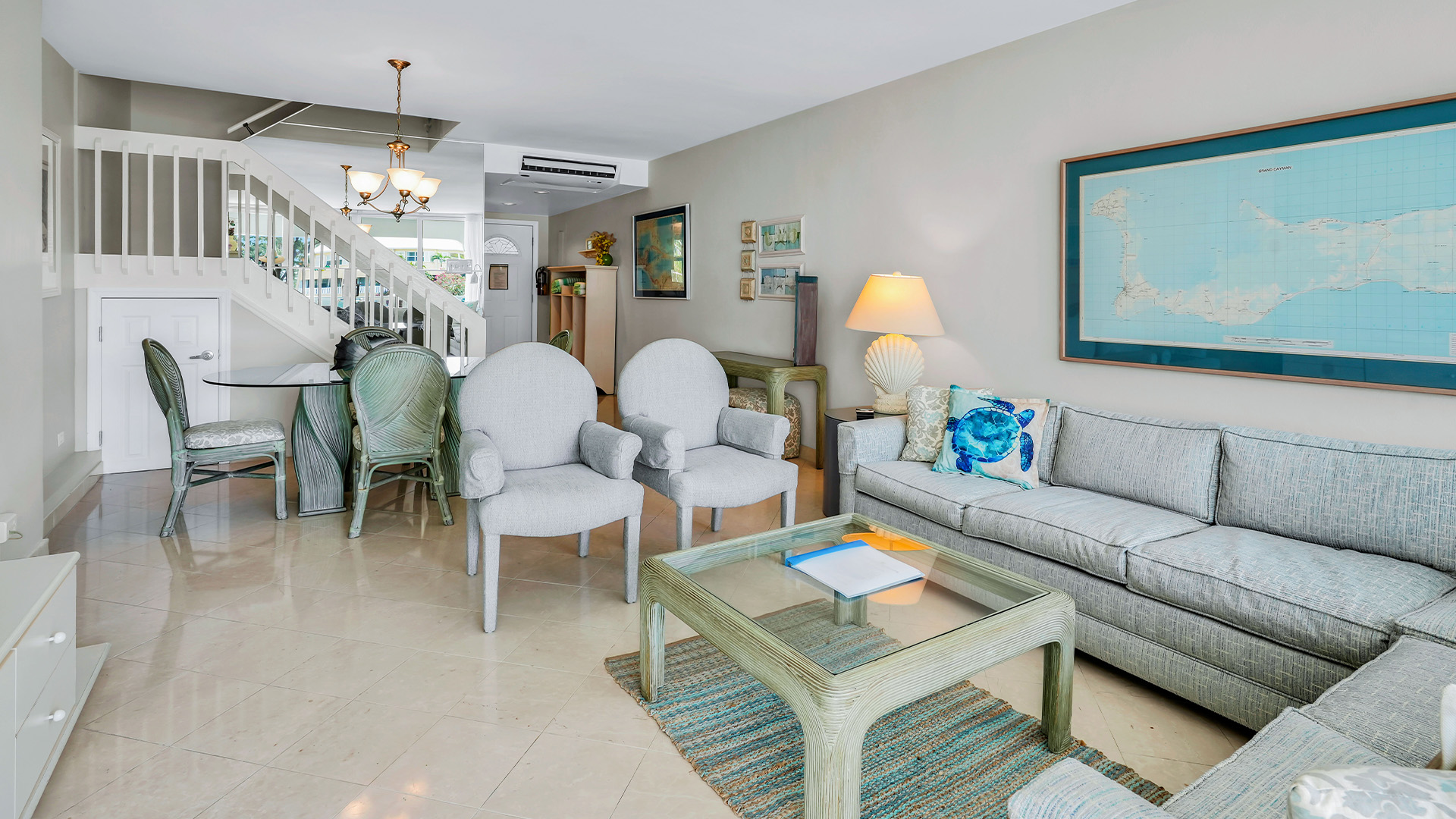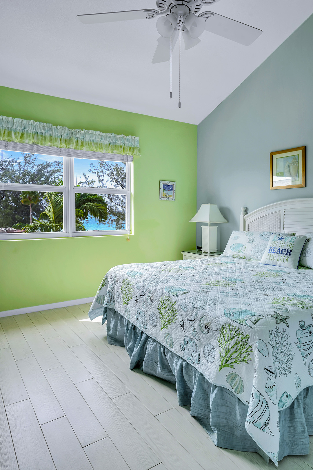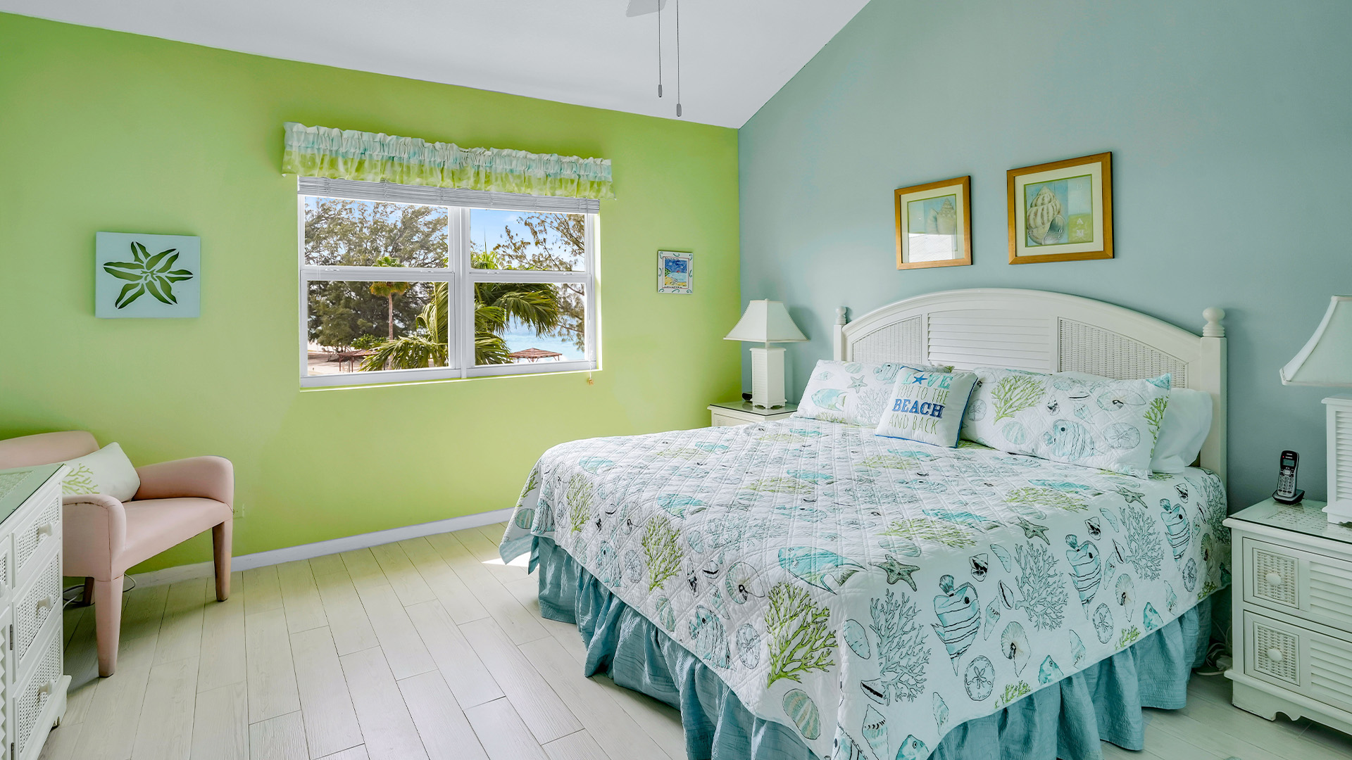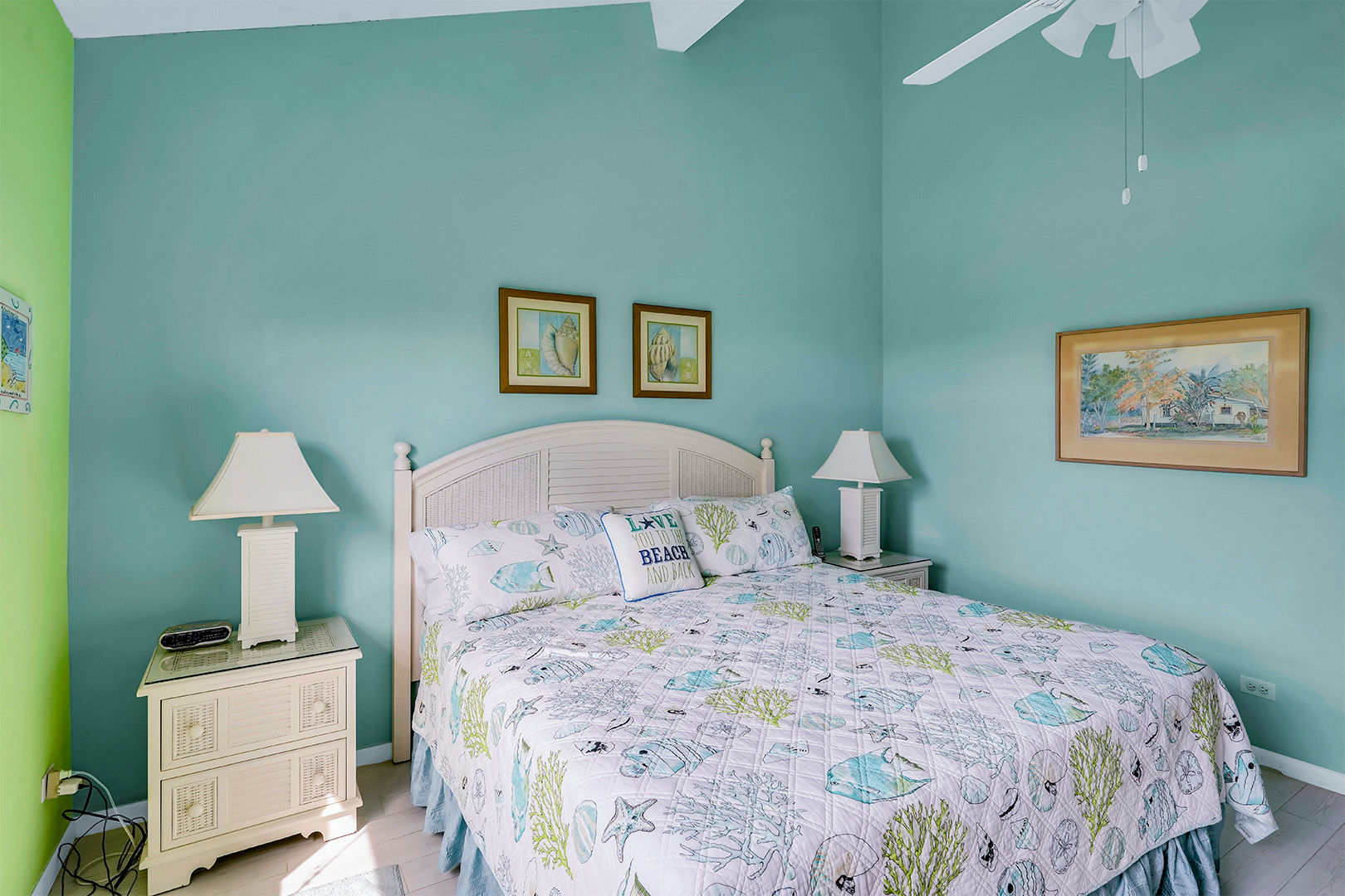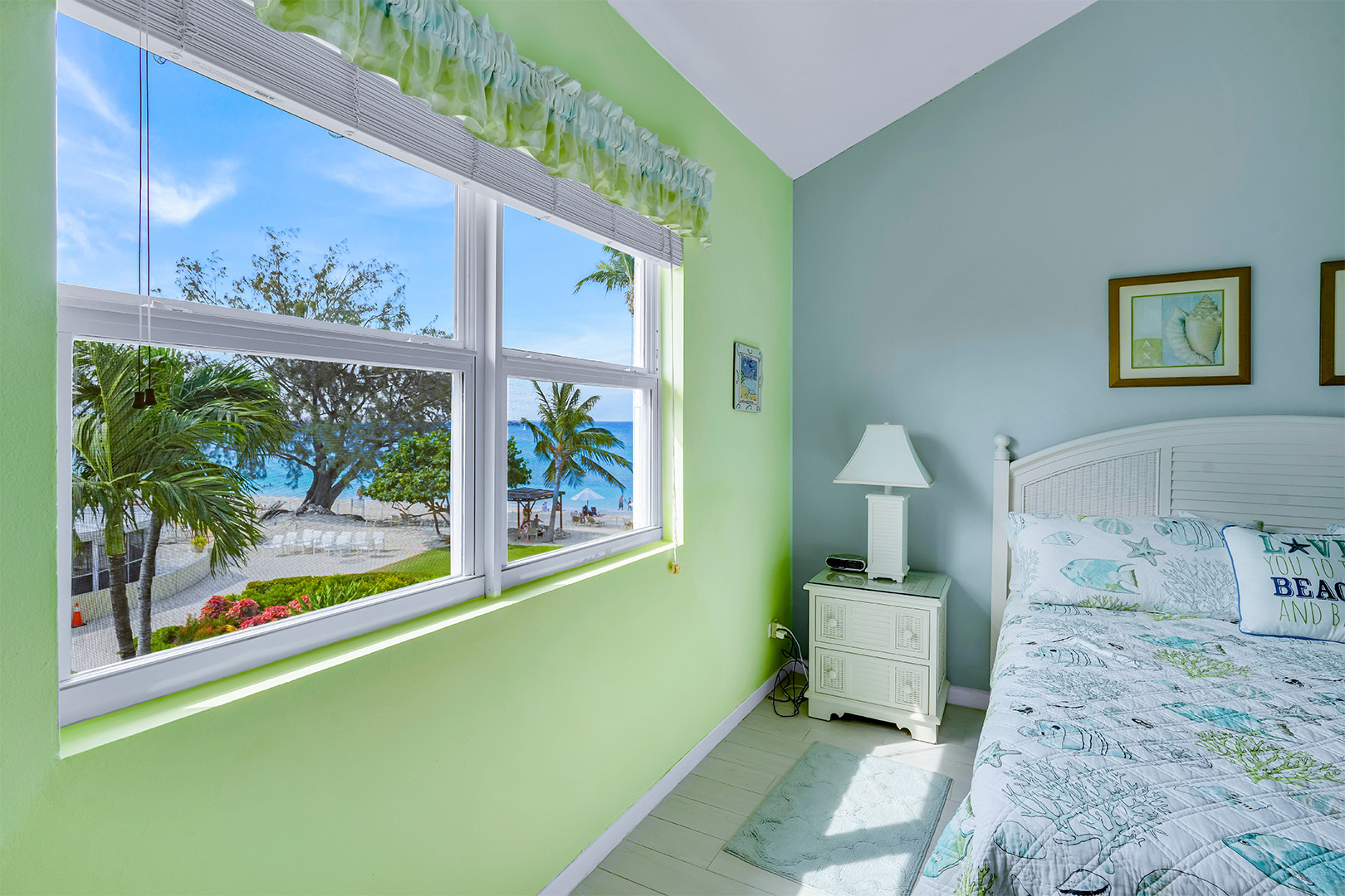 Welcome to Townhouse 25, a peaceful second-floor retreat offering panoramic views, privacy, and the beauty of beachside living. This spacious unit, centrally located on Seven Mile Beach, includes 2 bedrooms and 2.5 bathrooms. The primary bedroom features a plush king-sized bed and a 3-piece ensuite bathroom with a walk-in shower. Being a second-floor North Building apartment, the secondary bedroom provides extra square footage relative to similar options. It includes a queen-sized bed and twin bunk beds decorated with ocean-inspired comforters and pillows. The adjacent bathroom includes a single sink vanity and a shower and tub combo.