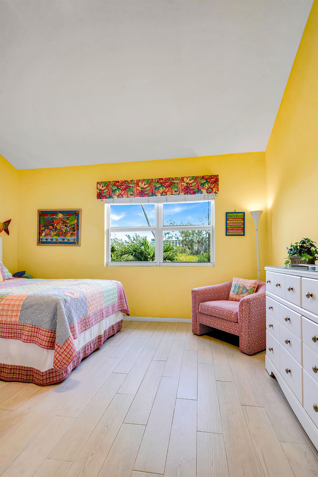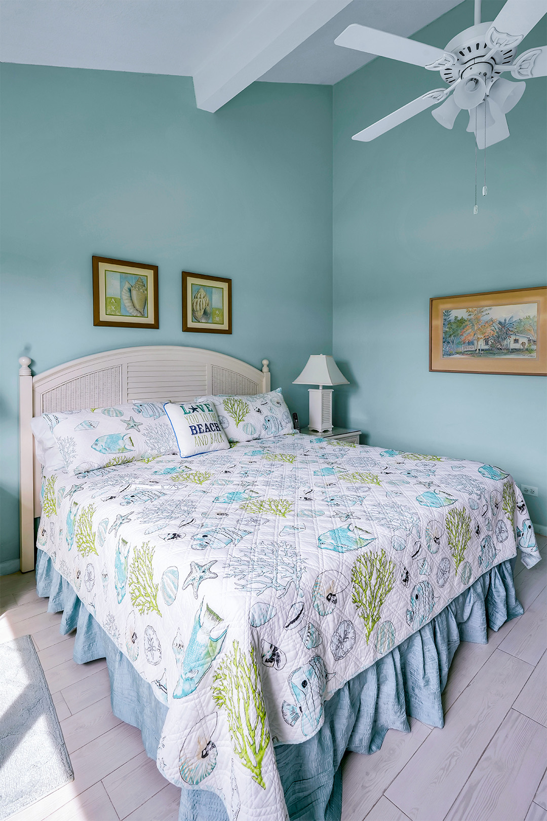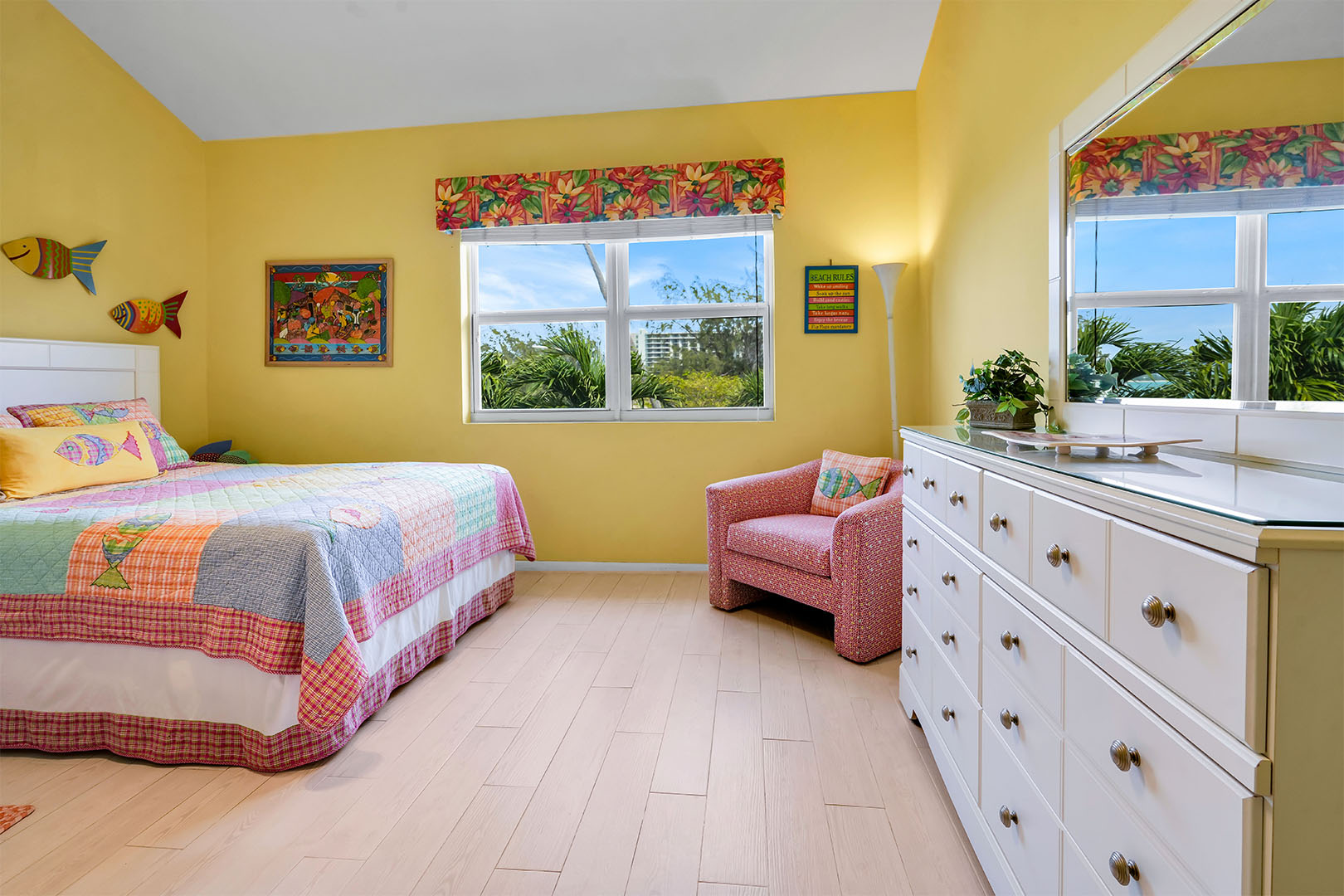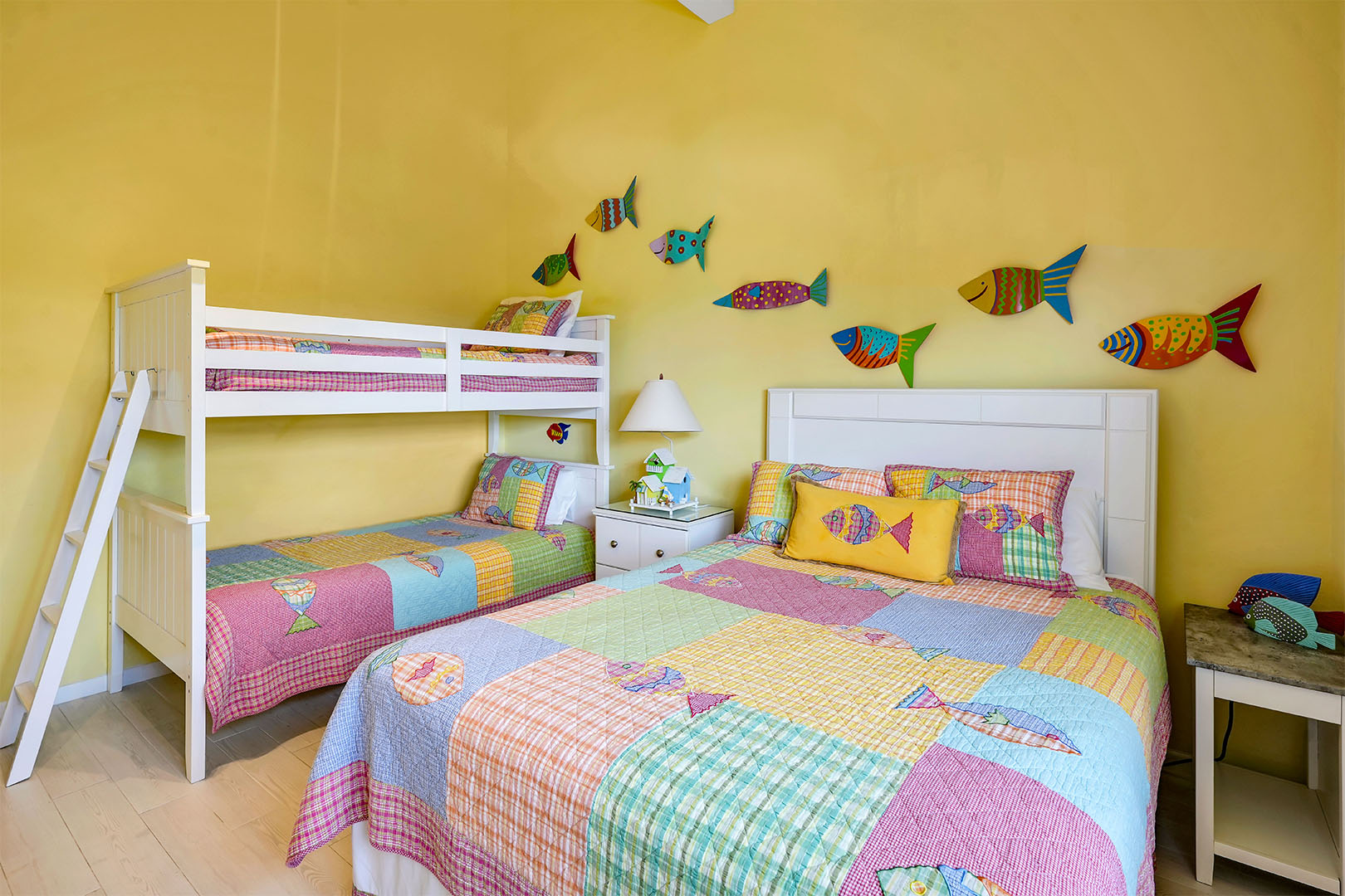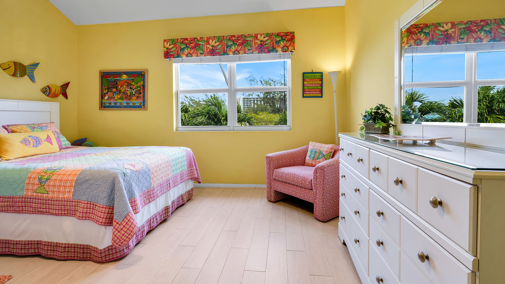 Welcome to Townhouse 25, a peaceful second-floor retreat offering panoramic views, privacy, and the beauty of beachside living. This spacious unit, centrally located on Seven Mile Beach, includes 2 bedrooms and 2.5 bathrooms. The primary bedroom features a plush king-sized bed and a 3-piece ensuite bathroom with a walk-in shower. Being a second-floor North Building apartment, the secondary bedroom provides extra square footage relative to similar options. It includes a queen-sized bed and twin bunk beds decorated with ocean-inspired comforters and pillows. The adjacent bathroom includes a single sink vanity and a shower and tub combo.