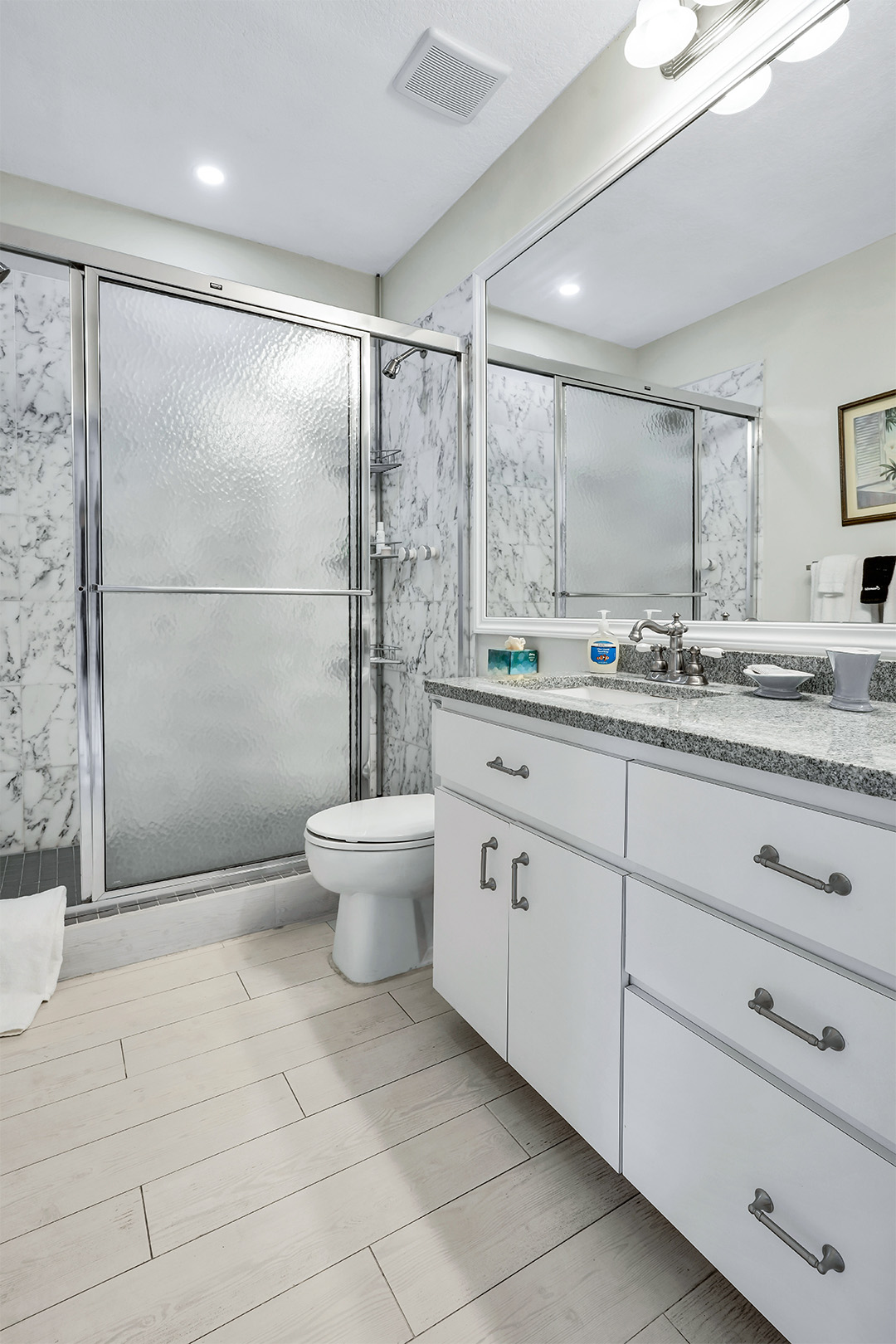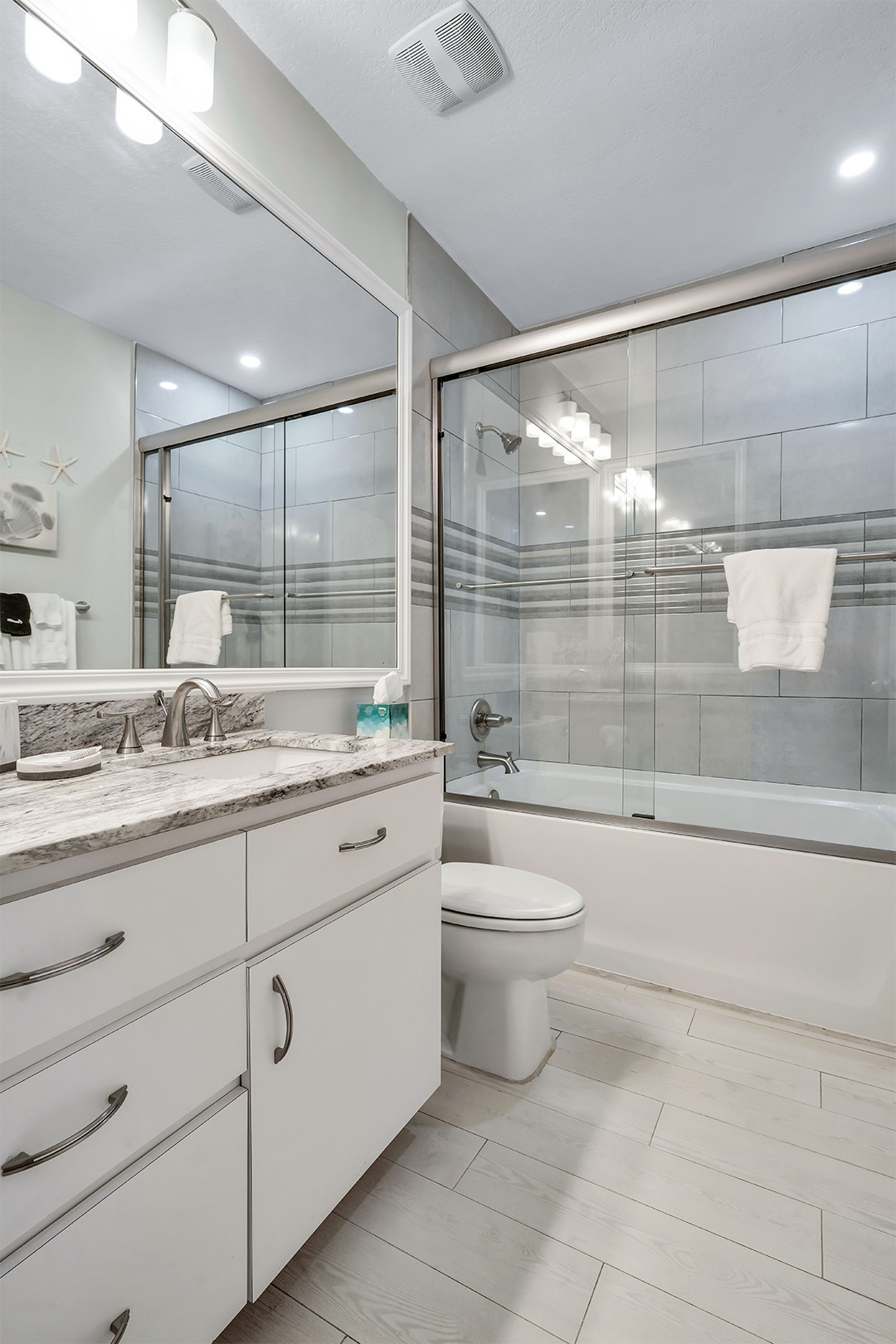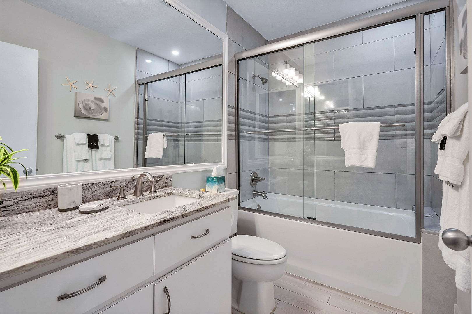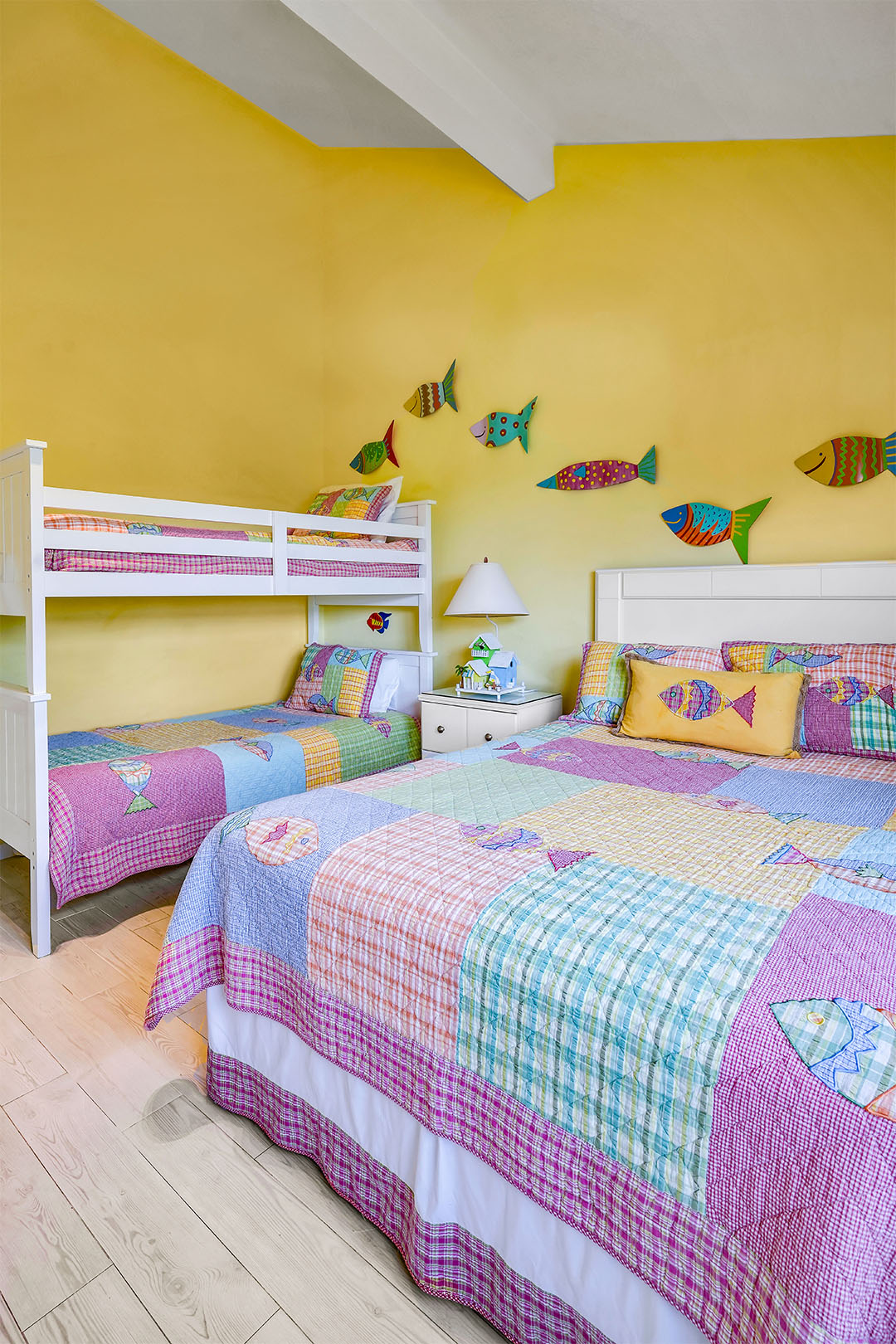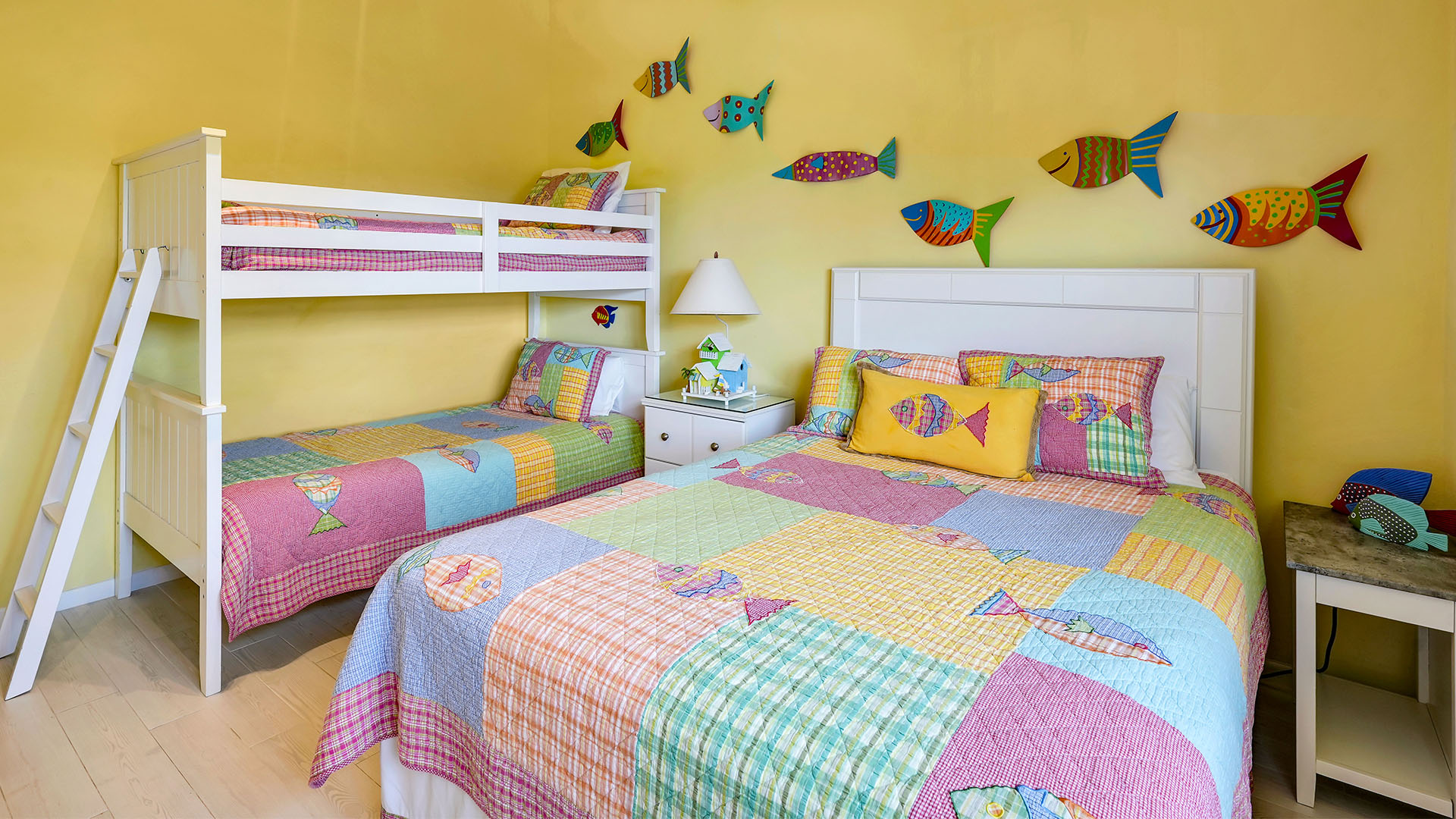 Welcome to Townhouse 25, a peaceful second-floor retreat offering panoramic views, privacy, and the beauty of beachside living. This spacious unit, centrally located on Seven Mile Beach, includes 2 bedrooms and 2.5 bathrooms. The primary bedroom features a plush king-sized bed and a 3-piece ensuite bathroom with a walk-in shower. Being a second-floor North Building apartment, the secondary bedroom provides extra square footage relative to similar options. It includes a queen-sized bed and twin bunk beds decorated with ocean-inspired comforters and pillows. The adjacent bathroom includes a single sink vanity and a shower and tub combo.