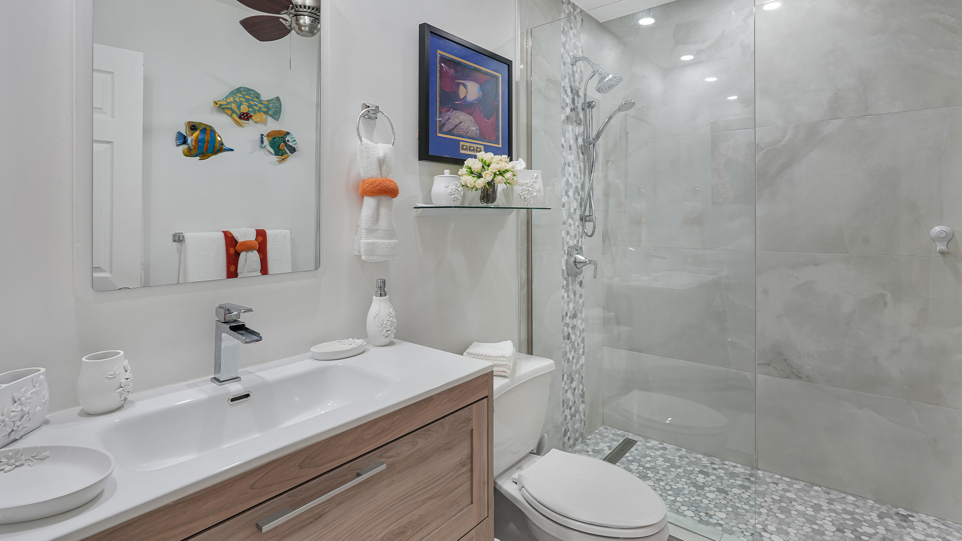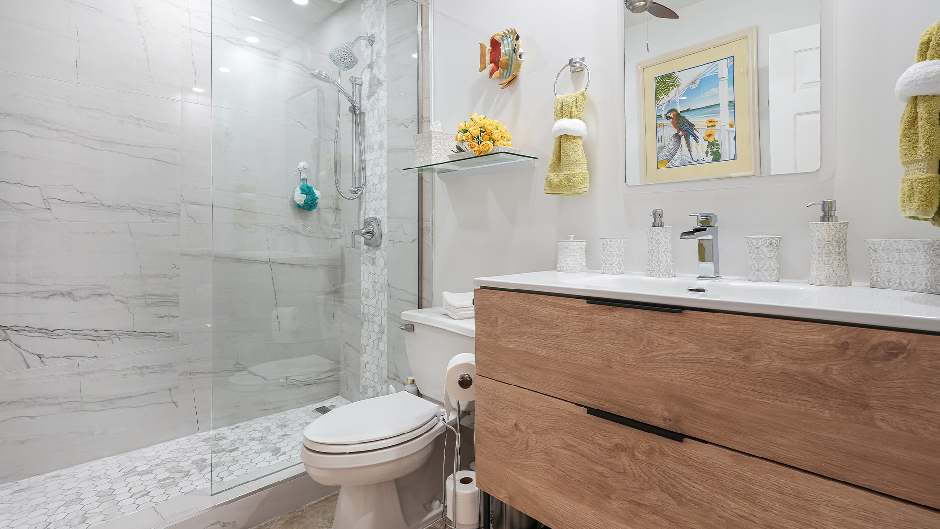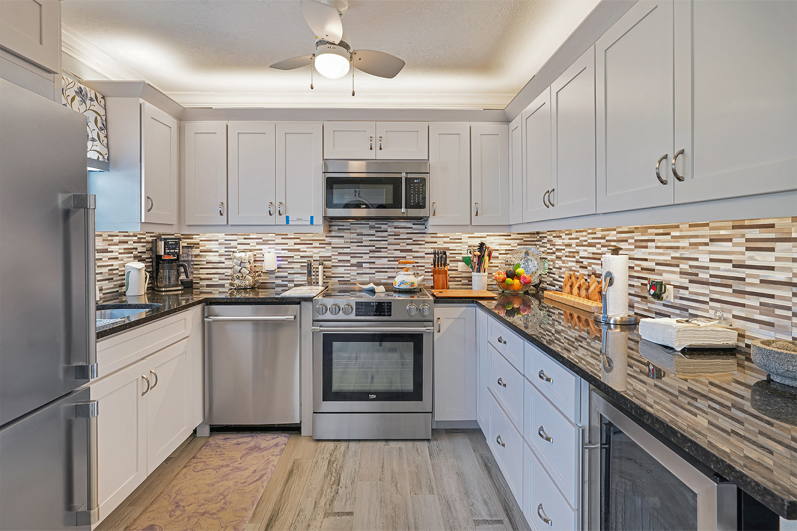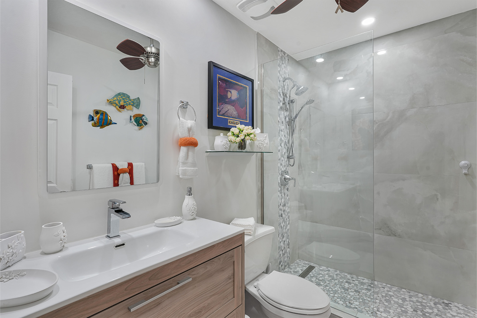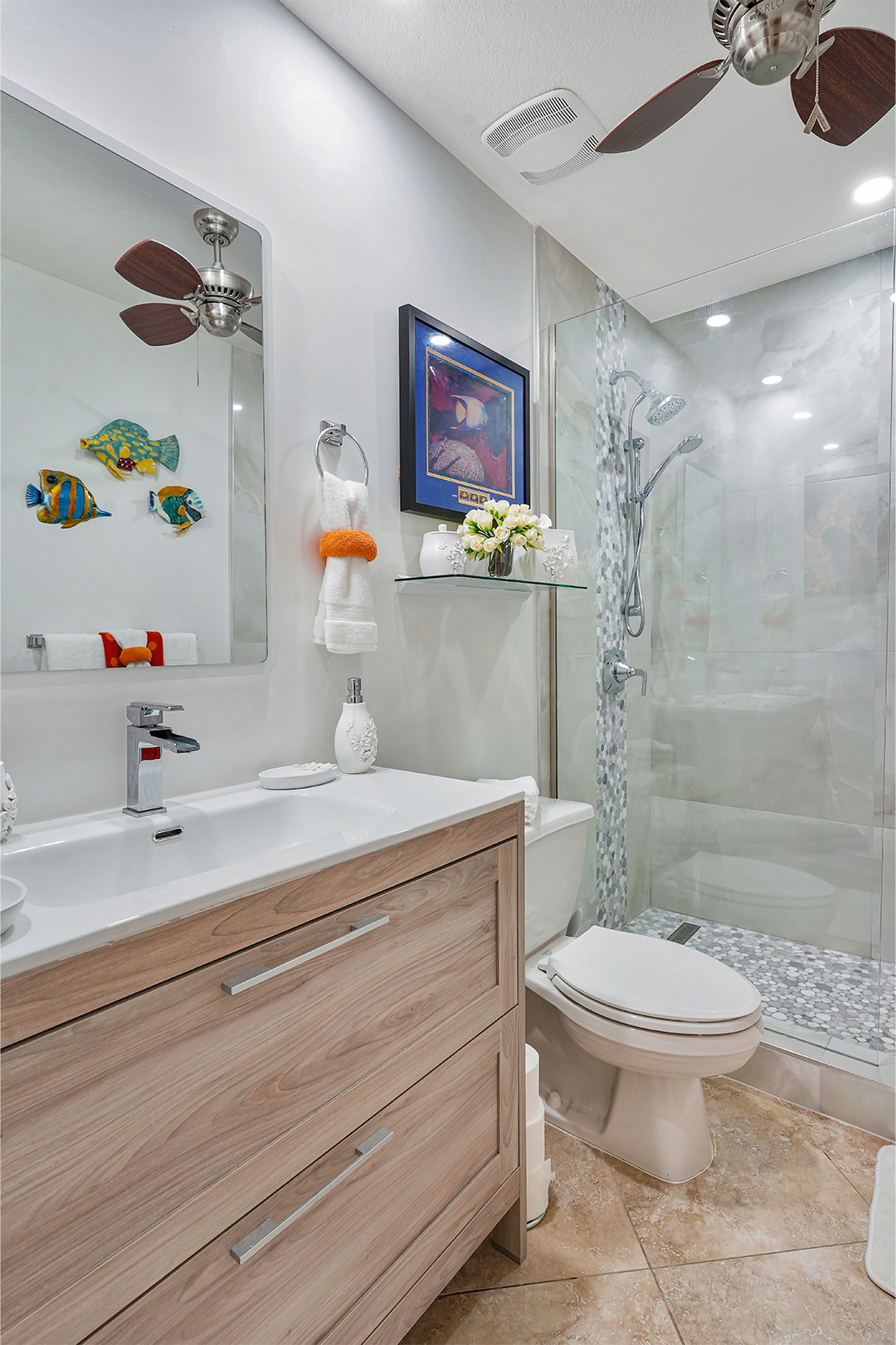 The primary bedroom features a plush king-sized bed, a closet, and an ensuite bathroom with a walk-in shower. The secondary bedroom features a queen bed, with access to a spacious bathroom featuring a single-sink vanity and another walk-in shower. The fully-equipped kitchen includes brand new, top of the line appliances with sleek countertops and a stylish mosaic backsplash, making it a breeze to cook or entertain. The living room provides comfortable seating, a flat-screen TV, and ocean-inspired artwork.
