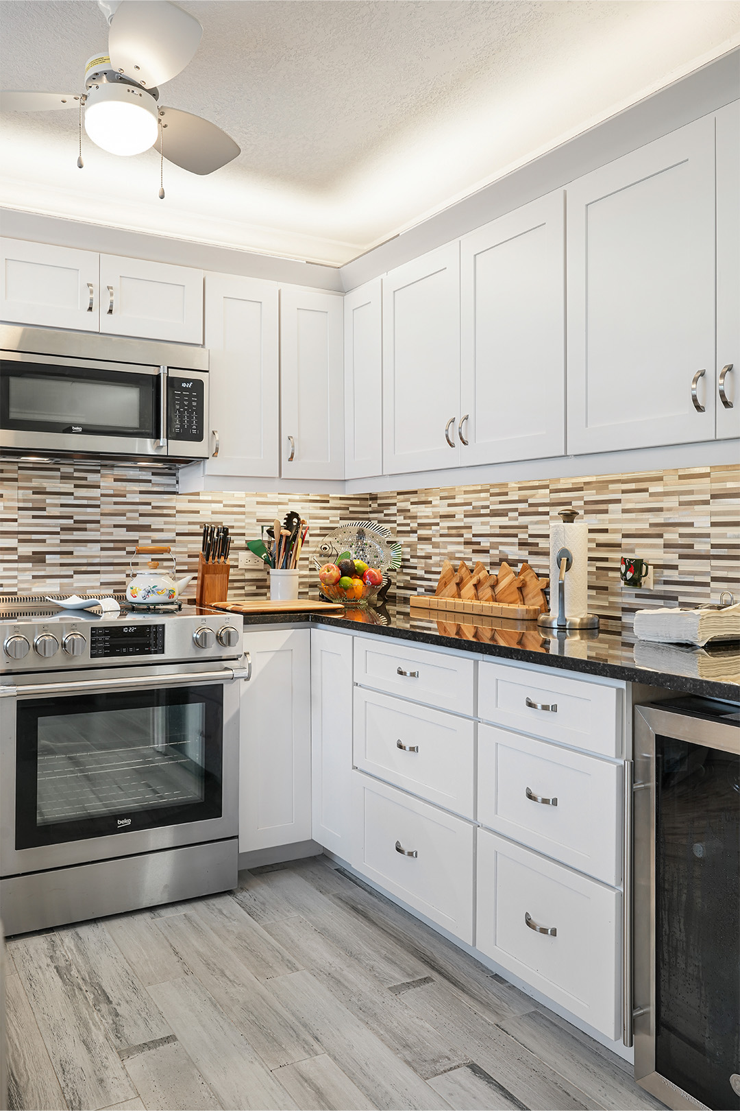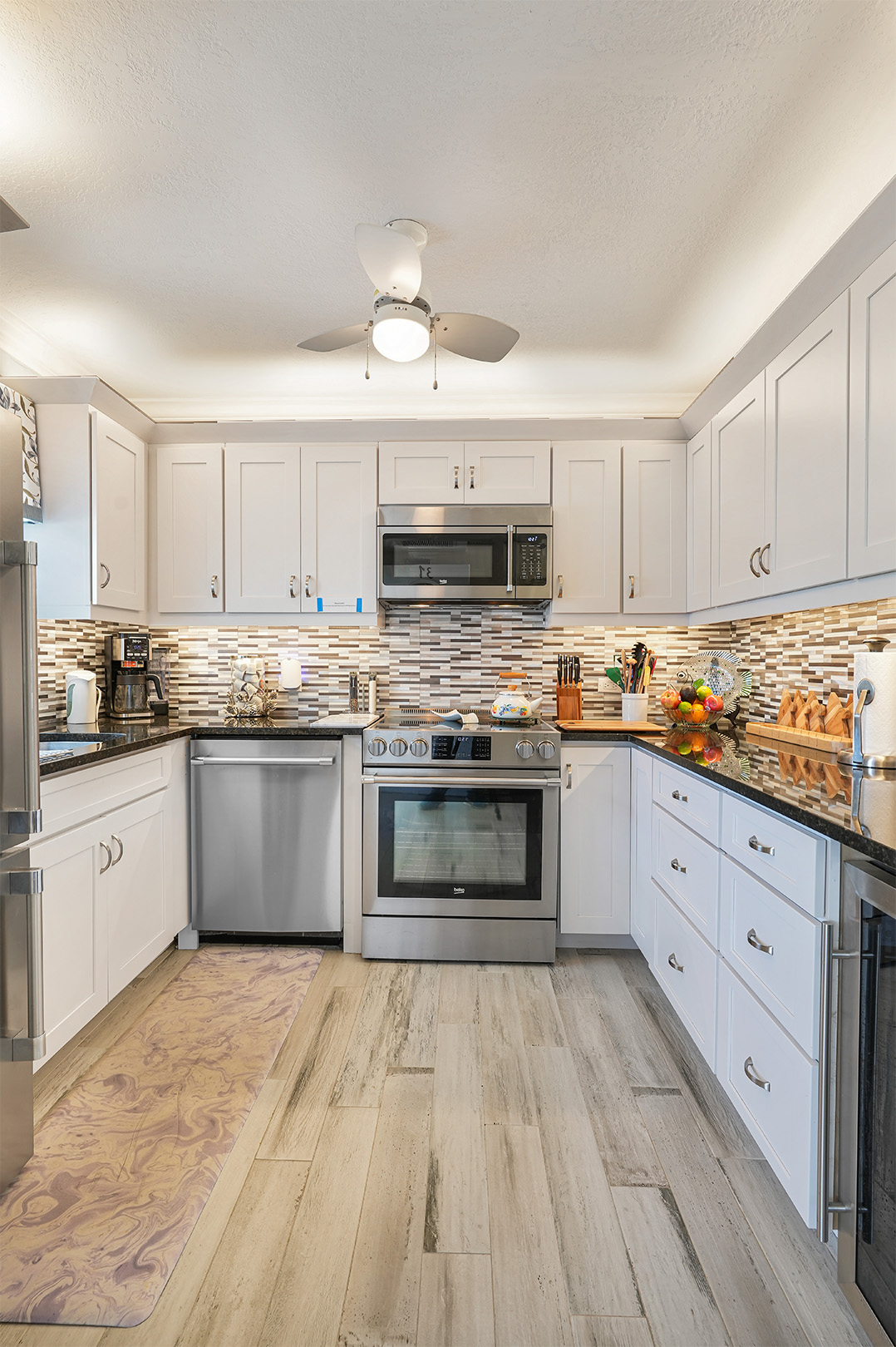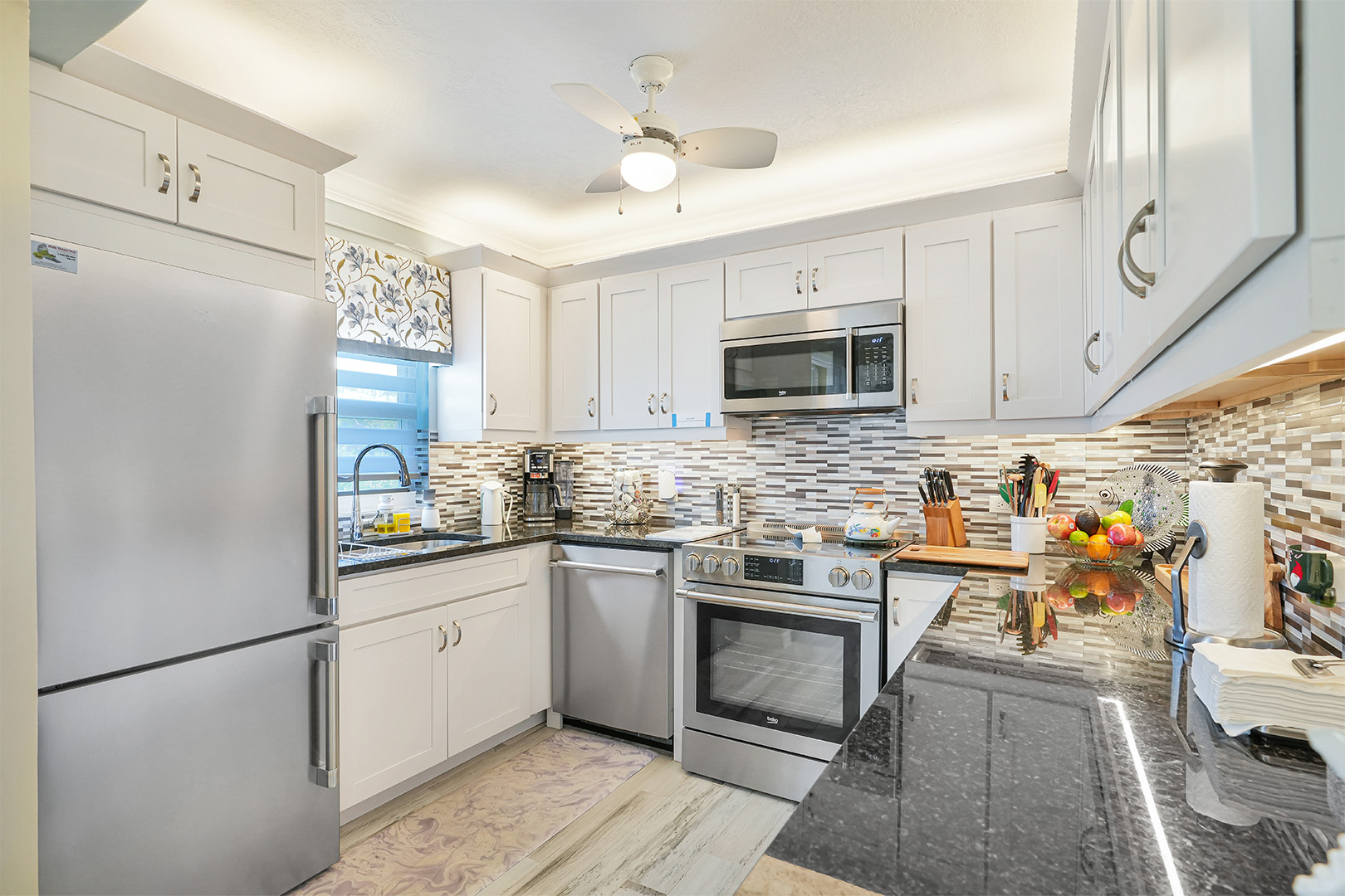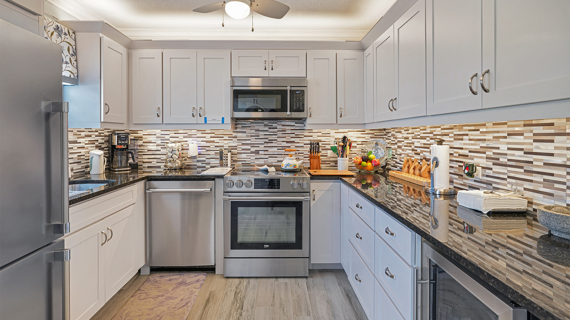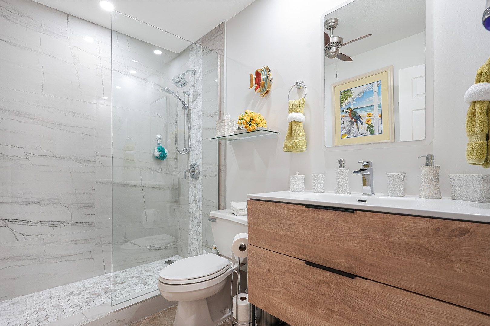 The primary bedroom features a plush king-sized bed, a closet, and an ensuite bathroom with a walk-in shower. The secondary bedroom features a queen bed, with access to a spacious bathroom featuring a single-sink vanity and another walk-in shower. The fully-equipped kitchen includes brand new, top of the line appliances with sleek countertops and a stylish mosaic backsplash, making it a breeze to cook or entertain. The living room provides comfortable seating, a flat-screen TV, and ocean-inspired artwork.